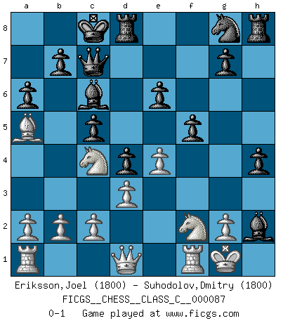 Last move : 0-1 2009 January 11 6:34:30 [Event "FICGS__CHESS__CLASS_C__000087"] [Site "FICGS"] [Date "2008.07.20"] [Round "1"] [White "Eriksson,Joel"] [Black "Suhodolov,Dmitry"] [Result "0-1"] [WhiteElo "1800"] [BlackElo "1800"] 1.e4 e6 2.Nf3 d5 3.Nc3 d4 4.Ne2 c5 5.Ng3 Nc6 6.Bb5 Bd7 7.O-O a6 8.Bxc6 Bxc6 9.Ne5 Qc7 10.f4 h5 11.d3 h4 12.Nh1 O-O-O 13.Nf2 f5 14.Bd2 Bd6 15.Nc4 Bxf4 16.Ba5 Bxh2+ 0-1 This chess game has been lost on time (started : 2008.07.20 13:21:22) French defense Kingside Castling by player White (move 7) Queenside Castling by player Black (move 12) Player Black won this chess game. Follow this game move after move (download)Many Chess players were surprised when after the game, Fischer quietly explained: 'I had already analyzed this possibility' in a position which I thought was not possible to foresee from the opening. (Mikhail Tal) Kleine Schachspieler machen Mist, und große Schachspieler machen Mist, aber große machen weniger Mist. (Fritz Sämisch) Una clavada es mas poderosa que una espada. (Fred Reinfeld) Tout change constamment, y compris dans le monde des Echecs. (Botvinnik) The good fighters of old first put themselves beyond the possibility of defeat, and then waited for an opportunity of defeating the enemy. (Sun Tzu)