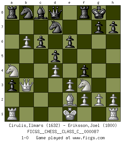 Last move : 1-0 2008 November 17 9:18:8 [Event "FICGS__CHESS__CLASS_C__000087"] [Site "FICGS"] [Date "2008.07.20"] [Round "1"] [White "Cirulis,Ilmars"] [Black "Eriksson,Joel"] [Result "1-0"] [WhiteElo "1632"] [BlackElo "1800"] 1.d4 d5 2.c4 e6 3.e3 c6 4.Nc3 f5 5.Nf3 Nf6 6.c5 b6 7.b4 a5 8.Na4 Nfd7 9.cxb6 Bxb4+ 10.Bd2 O-O 11.Bxb4 axb4 12.a3 bxa3 13.Qb3 f4 14.Be2 1-0 This chess game has been lost on time (started : 2008.07.20 13:21:22) Queen's gambit declined Kingside Castling by player Black (move 10) Player White won this chess game. Follow this game move after move (download)The enormous mental resilience, without which no Chess player can exist, was so much taken up by Chess that he could never free his mind of this game. (Albert Einstein) Mein erstes Ziel war nicht, die Partie zu gewinnen, sondern eine Figur zu opfern. -- der junge (Wilhelm Steinitz) Bobby Fischer es el jugador de Ajedrez mas grande que jamás haya existido. (Ken Smith) La conception d'un plan est le processus par lequel un joueur exploite les avantages de sa position tout en s'efforçant d'en réduire au minimum les inconvénients. Afin de garantir le succès, un plan doit toujours se fonder sur un diagnostic objectif des particularités d'une position. La conception d'un plan est d'autant plus difficile que la position est équilibrée, et grandement facilitée lorsqu'il n'existe qu'un seul plan susceptible de répondre aux exigences de la position. (Harry Golombek) Humor is by far the most significant activity of the human brain. (Edward De Bono)