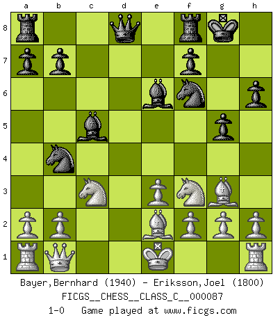 Last move : 1-0 2008 November 16 21:14:59 [Event "FICGS__CHESS__CLASS_C__000087"] [Site "FICGS"] [Date "2008.07.20"] [Round "1"] [White "Bayer,Bernhard"] [Black "Eriksson,Joel"] [Result "1-0"] [WhiteElo "1940"] [BlackElo "1800"] 1.d4 d5 2.c4 e6 3.Nc3 c5 4.cxd5 cxd4 5.Qa4+ Bd7 6.Qxd4 exd5 7.Qxd5 Nc6 8.Nf3 Nf6 9.Qd3 Bc5 10.Bg5 Nb4 11.Qb1 O-O 12.e3 h6 13.Bh4 Be6 14.Be2 g5 15.Bg3 1-0 This chess game has been lost on time (started : 2008.07.20 13:21:22) QGD : Tarrasch, von Hennig-Schara gambit Kingside Castling by player Black (move 11) Player White won this chess game. Follow this game move after move (download)Chess is a terrible game. If you have no center, your opponent has a freer position. If you do have a center, then you really have something to worry about ! (Siegbert Tarrasch) Ein guter Spieler hat immer Glück. (José Raúl Capablanca) El Ajedrez es la vida. (Bobby Fischer) Les échecs c'est le défi de l'alpiniste, toujours plus haut, prêt à tout pour monter à l'assaut du Roi ennemi. Les échecs, c'est de la musique en mouvement, un ballet majestueux pour les yeux. C'est de la poésie composée par les fantômes du passé qui au même titre que Rimbaud ou Verlaine méritent notre admiration. Les échecs, c'est de la peinture ou le moindre mouvement modifie le tableau pour en faire un Picasso ou un Van Gogh. Les échecs, c'est tout et rien, c'est la vie et la mort. Jjulie33 sur le forum de France-Echecs. The existence of forgetting has never been proved: We only know that some things don't come to mind when we want them. (Friedrich Nietzsche)