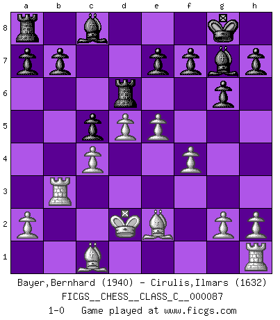 Last move : 1-0 2008 October 11 10:57:49 [Event "FICGS__CHESS__CLASS_C__000087"] [Site "FICGS"] [Date "2008.07.20"] [Round "1"] [White "Bayer,Bernhard"] [Black "Cirulis,Ilmars"] [Result "1-0"] [WhiteElo "1940"] [BlackElo "1632"] 1.d4 Nf6 2.c4 g6 3.Nc3 d5 4.cxd5 Nxd5 5.e4 Nxc3 6.bxc3 Bg7 7.Nf3 c5 8.Rb1 O-O 9.Be2 Nc6 10.d5 Ne5 11.Nxe5 Bxe5 12.Qd2 Qa5 13.Rb3 Rd8 14.f4 Bg7 15.c4 Qxd2+ 16.Kxd2 Rd6 17.e5 1-0 King's Indian defense, 3.Nc3 Kingside Castling by player Black (move 8) Player White won this chess game. Follow this game move after move (download)It is always better to sacrifice your opponent's men. (Savielly Tartakower) Obwohl ich alt bin, darf mir niemand den Finger in den Mund stecken, sonst beisse ich. (Wilhelm Steinitz) Todavía soy una víctima del Ajedrez. Tiene toda la belleza del arte y mucho mas. No puede ser comercializado. El Ajedrez es mas puro que el arte en su posición social. (Marcel Duchamp) Les Cavaliers se révèlent fort utiles dans les positions fermées. D'habitude, les Fous sont un peu plus forts que les Cavaliers dans les positions ouvertes. Qu'on le veuille ou non, il restera toujours des exceptions ! Logic : The art of thinking and reasoning in strict accordance with the limitations and incapacities of the human misunderstanding. (Ambrose Bierce)