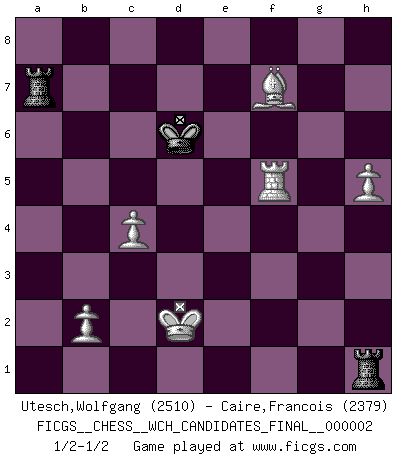Last move : 1/2-1/2 2008 December 24 5:15:54 [Event "FICGS__CHESS__WCH_CANDIDATES_FINAL__000002"] [Site "FICGS"] [Date "2008.07.21"] [Round "1"] [White "Utesch,Wolfgang"] [Black "Caire,Francois"] [Result "1/2-1/2"] [WhiteElo "2510"] [BlackElo "2379"] 1.e4 c5 2.Nf3 Nc6 3.d4 cxd4 4.Nxd4 Nf6 5.Nc3 d6 6.Bg5 e6 7.Qd2 Be7 8.O-O-O O-O 9.f4 h6 10.Bh4 Nxd4 11.Qxd4 Qa5 12.Bc4 e5 13.fxe5 dxe5 14.Qd3 Bg4 15.Rdf1 Rac8 16.Bxf6 Bxf6 17.Kb1 Qc5 18.Bb3 Bh4 19.h3 Be6 20.g3 Be7 21.Qe2 Qc6 22.Rf3 Rcd8 23.Nd5 Bc5 24.g4 b6 25.g5 hxg5 26.Rg3 Bxd5 27.Bxd5 Qh6 28.Rf1 Rd6 29.Rf5 Rf6 30.Rfxg5 g6 31.a3 Kh8 32.Rg2 Kg7 33.Qd3 Qh4 34.Rxe5 Qe1+ 35.Ka2 Rf1 36.Kb3 Qa1 37.Qc3 Qe1 38.Rd2 Qe3 39.Rd3 Qe1 40.Bb7 Kh6 41.Rxc5 bxc5 42.Qxc5 Re8 43.Qxa7 Re7 44.Qb8 Kg7 45.Rd8 Qe3+ 46.Ka2 Qf4 47.Bd5 Qxb8 48.Rxb8 Rd1 49.c4 f5 50.exf5 gxf5 51.a4 f4 52.Rg8+ Kf6 53.a5 R7e1 54.h4 Ke7 55.Rg7+ Kd6 56.Rg5 f3 57.Rf5 Ra1+ 58.Kb3 f2 59.Rxf2 Kc5 60.Rf3 Rxa5 61.Bf7 Ra7 62.Rf5+ Kd6 63.Kc3 Rc1+ 64.Kd2 Rh1 65.h5 1/2-1/2 Sicilian defense Queenside Castling by player White (move 8) Kingside Castling by player Black (move 8) 10 pieces endgame at move 59 : White KRBPPPP , Black KRR WHITE : King + 1 Rook 1 Bishop 4 Pawns BLACK : King + 2 Rooks 9 pieces endgame at move 60 : White KRBPPP , Black KRR WHITE : King + 1 Rook 1 Bishop 3 Pawns BLACK : King + 2 Rooks This chess game ended in a draw. Follow this game move after move (download)If you aren't afraid of Spassky, then I have removed the element of money. (Jim Slater) Wenn Du einsam bist, wenn Du Dich in der Welt wie ein Fremder fühlst, spiele Schach. Das wird Deinen Geist erheben und Dein Ratgeber im Kampf sein. (Aristoteles) Todo lo que importa ante el tablero de Ajedrez son buenas jugadas. (Bobby Fischer) On croit qu'il y a plus de mauvais joueurs que de bons joueurs, c'est faux : Il y a autant de joueurs qui gagnent que de joueurs qui perdent. (Philippe Geluck) All men can see these tactics whereby I conquer, but what none can see is the strategy out of which victory is evolved. (Sun Tzu)