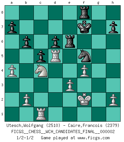 Last move : 1/2-1/2 2008 November 1 17:56:49 [Event "FICGS__CHESS__WCH_CANDIDATES_FINAL__000002"] [Site "FICGS"] [Date "2008.07.21"] [Round "3"] [White "Utesch,Wolfgang"] [Black "Caire,Francois"] [Result "1/2-1/2"] [WhiteElo "2510"] [BlackElo "2379"] 1.d4 Nf6 2.c4 e6 3.Nf3 b6 4.g3 Ba6 5.Qc2 c5 6.d5 exd5 7.cxd5 Bb7 8.Bg2 Nxd5 9.O-O Be7 10.Rd1 Qc8 11.a3 Nc7 12.Nc3 O-O 13.Bf4 Ne6 14.Bd6 Nc6 15.Nb5 Qd8 16.Bxe7 Nxe7 17.Ng5 Nxg5 18.Bxb7 Rb8 19.Nd6 Nc6 20.f4 Ne6 21.Nxf7 Ned4 22.Nxd8 Nxc2 23.Nxc6 Rxb7 24.Rac1 Ne3 25.Rd3 Nf5 26.Ne5 d6 27.Nc4 Re7 28.Kf2 g5 29.a4 gxf4 30.gxf4 Re6 31.e3 Kf7 32.Rd5 1/2-1/2 Queen's Indian : Nimzovich variation (exaggerated Fianchetto) Kingside Castling by player White (move 9) Kingside Castling by player Black (move 12) This chess game ended in a draw. Follow this game move after move (download)I feel as if I were a piece in a game of Chess, when my opponent says of it: That piece cannot be moved. (Soren Kierkegaard) Es ist wirklich schade, dass so viele Schachspieler nicht auf ihr Äußeres achten! (Alexandra Kosteniuk) El Ajedrez es una manera fabulosa para que los niños aprendan a autovalorarse y a autoestimarse. (Saudin Robovic) En blitz, le Cavalier l'emporte sur le Fou. (Vlastimil Hort) To steal ideas from one person is plagiarism. To steal from many is research. (Unknown)
