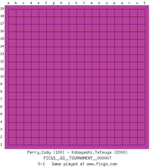 Last move : 0-1 2006 August 26 18:45:33 [Event "FICGS__GO__TOURNAMENT__000007"] [Site "FICGS"] [Date "2006.07.27"] [Round "1"] [Black "Perry,Cody"] [White "Kobayashi,Tetsuya"] [Result "0-1"] [Rating 1 "100"] [Rating 2 "2000"] 0-1 This go game has been lost on time (started : 2006.07.27 16:39:34) Here are the names of the openings (joseki) played in the four corners : Player White won this Go (weiqi, baduk) game. Follow this game move after move (download)The comb formation is alive. (Anonymous) A government big enough to give you everything you want is strong enough to take everything you have. (Thomas Jefferson)