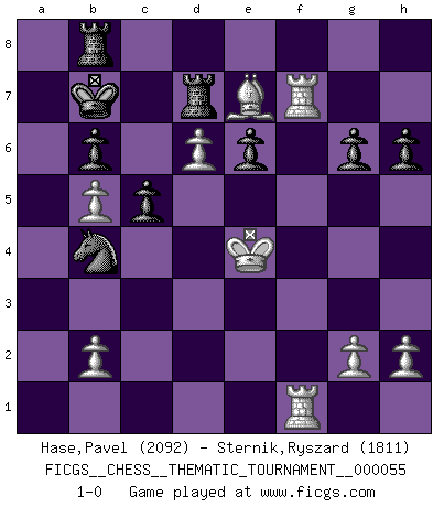 Last move : 1-0 2008 August 18 10:2:18 [Event "FICGS__CHESS__THEMATIC_TOURNAMENT__000055"] [Site "FICGS"] [Date "2008.07.21"] [Round "1"] [White "Hase,Pavel"] [Black "Sternik,Ryszard"] [Result "1-0"] [WhiteElo "2092"] [BlackElo "1811"] 1.e4 Nf6 2.e5 Nd5 3.d4 d6 4.Nf3 g6 5.Bc4 Nb6 6.Bb3 Bg7 7.O-O Nc6 8.Ng5 e6 9.f4 dxe5 10.dxe5 Qd4+ 11.Kh1 h6 12.Nf3 Qxd1 13.Rxd1 Na5 14.Na3 Bd7 15.Be3 Nxb3 16.axb3 Nd5 17.Bd2 a6 18.c4 Ne7 19.Nc2 Nf5 20.Kg1 Bc6 21.Ncd4 Be4 22.Re1 Bxf3 23.Nxf3 O-O-O 24.Bc3 Rd3 25.Kf2 Bf8 26.b4 c5 27.b5 axb5 28.cxb5 Kb8 29.Re4 Kc7 30.Ke2 Rd8 31.Ba5+ b6 32.Bc3 Rb8 33.Rea4 Ne7 34.Nd2 Nd5 35.Nc4 Nxf4+ 36.Kf3 Nd5 37.Nd6 Bxd6 38.Ra7+ Kc8 39.exd6 f6 40.Rf7 Rd8 41.Bxf6 Rd7 42.Be7 Kb7 43.Ke4 Nb4 44.Raf1 1-0 Alekhine's defense : Modern, Fianchetto variation Kingside Castling by player White (move 7) Queenside Castling by player Black (move 23) Player White won this chess game. Follow this game move after move (download)What is the object of playing a gambit opening?... To acquire a reputation of being a dashing player at the cost of losing a game. (Siegbert Tarrasch) Die Arbeit ist etwas Unnatürliches. Die Faulheit allein ist göttlich. (Anatole France) No hay precio que no valga la pena por la cabellera del Rey enemigo. (Koblentz) Tout change constamment, y compris dans le monde des Echecs. (Botvinnik) There is no instance of a country having benefited from prolonged warfare. (Sun Tzu)