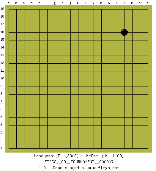 Last move : 1-0 2006 August 27 18:47:27 [Event "FICGS__GO__TOURNAMENT__000007"] [Site "FICGS"] [Date "2006.07.27"] [Round "1"] [Black "Kobayashi,Tetsuya"] [White "McCarty,Michael"] [Result "1-0"] [Rating 1 "2000"] [Rating 2 "100"] 1.q16 1-0 This go game has been lost on time (started : 2006.07.27 16:39:34) Here are the names of the openings (joseki) played in the four corners : Player Black won this Go (weiqi, baduk) game. Follow this game move after move (download)Big groups never die. (Anonymous) The problem with troubleshooting is that trouble shoots back. (Anonymous)