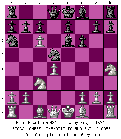 Last move : 1-0 2008 October 11 11:17:35 [Event "FICGS__CHESS__THEMATIC_TOURNAMENT__000055"] [Site "FICGS"] [Date "2008.07.21"] [Round "1"] [White "Hase,Pavel"] [Black "Inving,Yugi"] [Result "1-0"] [WhiteElo "2092"] [BlackElo "1591"] 1.e4 Nf6 2.e5 Nd5 3.d4 d6 4.Nf3 Bf5 5.c4 Nb6 6.Nc3 dxe5 7.Nxe5 f6 8.Nf3 Na6 9.Nh4 Be6 10.c5 Nd5 11.c6 1-0 Alekhine's defense : Modern variation Player White won this chess game. Follow this game move after move (download)Could we look into the head of a Chess player, we should see there a whole world of feelings, images, ideas, emotion and passion. (Alfred Binet) Intelligenz läßt sich nicht am Weg, sondern nur am Ergebnis feststellen. (Garry Kasparov) Cada Peón es potencialmente una Reina. (James Mason) Botvinnik disait en comparant les échecs à la musique: Il existe une science dont le but est l'étude de l'acoustique et des sons. Mais il y a aussi un art qui se sert de l'océan des sons : c'est la musique. De toute évidence, il en est de même pour la pensée. La logique est l'étude des lois de la réflexion et les échecs reflètent, en tant qu'art, le côté logique de la réflexion, sous la forme d'images artistiques... Extrait de Fischer - Spassky, Reykjavik 1972 par Alexander & F. Wyndham (Ed. Solar), p 37. A good programmer is someone who always looks both ways before crossing a one-way street. (Doug Linder)