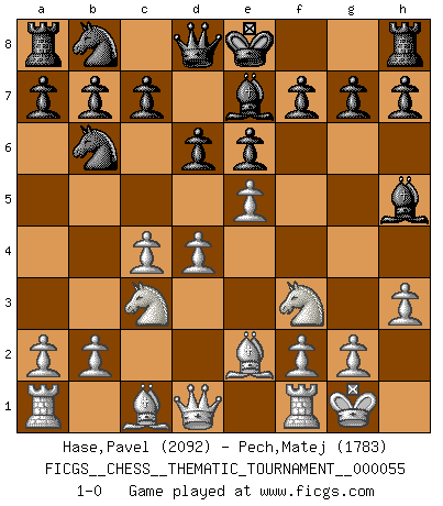 Last move : 1-0 2008 September 2 20:36:39 [Event "FICGS__CHESS__THEMATIC_TOURNAMENT__000055"] [Site "FICGS"] [Date "2008.07.21"] [Round "1"] [White "Hase,Pavel"] [Black "Pech,Matej"] [Result "1-0"] [WhiteElo "2092"] [BlackElo "1783"] 1.e4 Nf6 2.e5 Nd5 3.d4 d6 4.Nf3 Bg4 5.Be2 e6 6.O-O Be7 7.c4 Nb6 8.h3 Bh5 9.Nc3 1-0 This chess game has been lost on time (started : 2008.07.21 21:56:9) Alekhine's defense : Modern variation, 4...Bg4 Kingside Castling by player White (move 6) Player White won this chess game. Follow this game move after move (download)Fischer, who may or may not be mad as a hatter, has every right to be horrified. (Jeremy Silman) Ich war schon mal beim Dopingtest. Da musste ich Urin abgeben, während Dritte zusahen. (Elisabeth Pähtz) Un Peón pasado es un criminal, quién debe ser mantenido bajo candado y llave. Leves medidas, tales como vigilancia policiaca, no son suficientes. (Aaron Nimzovich) Nous sommes les pions de la mystérieuse partie d'Echecs jouée par Dieu. Il nous déplace, nous arrête, nous pousse encore, puis nous lance un à un dans la boîte du Néant. Epitaphe sur la tombe de David Janowsky (1868-1927). In God we trust, all others we virus scan. (Anonymous)