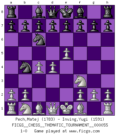 Last move : 1-0 2008 September 9 21:0:28 [Event "FICGS__CHESS__THEMATIC_TOURNAMENT__000055"] [Site "FICGS"] [Date "2008.07.21"] [Round "1"] [White "Pech,Matej"] [Black "Inving,Yugi"] [Result "1-0"] [WhiteElo "1783"] [BlackElo "1591"] 1.e4 Nf6 2.e5 Nd5 3.d4 Nc6 4.c4 Ndb4 5.Nf3 1-0 This chess game has been lost on time (started : 2008.07.21 21:56:9) Alekhine's defense Player White won this chess game. Follow this game move after move (download)Fischer was a master of clarity and a king of artful positioning. His opponents would see where he was going but were powerless to stop him. (Bruce Pandolfini) Kein Schachspieler kann gut schlafen. (H. G. Wells) El Ajedrez es un invernadero donde los frutos del carácter pueden madurar mas completamente que en la vida. (Edward Morgan Foster) Aux échecs, l'amour-propre est satisfait quand on remporte la victoire, mais il n'y a pas de honte à être battu. (Benjamin Franklin) Without enthusiasm, virtue functions not at all, and vice only poorly. (Mignon McLaughlin, The Neurotic's Notebook, 1960)