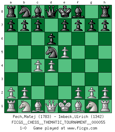 Last move : 1-0 2008 July 24 3:9:42 [Event "FICGS__CHESS__THEMATIC_TOURNAMENT__000055"] [Site "FICGS"] [Date "2008.07.21"] [Round "1"] [White "Pech,Matej"] [Black "Imbeck,Ulrich"] [Result "1-0"] [WhiteElo "1783"] [BlackElo "1342"] 1.e4 Nf6 2.e5 Nd5 3.d4 d6 4.c4 1-0 Alekhine's defense Player White won this chess game. Follow this game move after move (download)Chess is the art which expresses the science of logic. (Mikhail Botvinnik) Ich möchte Schüler heranbilden, die das Vermögen haben, selbst zu denken und Kritik zu üben. (Emanuel Lasker) Un entendimiento a fondo de las continuaciones típicas del mate, hace de las combinaciones de sacrificio mas complicadas conducirlas a ellas no solo sin dificultad, sino casi de una manera natural. (Siegbert Tarrasch) Aidez vos pièces, elles vous aideront. (Paul Morphy) Luck is what you have left over after you give 100 percent. (Langston Coleman)