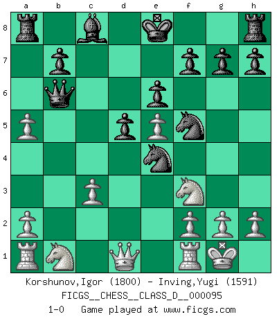 Last move : 1-0 2008 October 10 23:16:54 [Event "FICGS__CHESS__CLASS_D__000095"] [Site "FICGS"] [Date "2008.07.22"] [Round "1"] [White "Korshunov,Igor"] [Black "Inving,Yugi"] [Result "1-0"] [WhiteElo "1800"] [BlackElo "1591"] 1.e4 c6 2.d4 d5 3.e5 c5 4.dxc5 e6 5.Be3 Nh6 6.c3 Nd7 7.Bd3 Bxc5 8.Bf5 Nxf5 9.Bxc5 Nxc5 10.Nf3 Qb6 11.b4 Ne4 12.O-O a5 13.bxa5 1-0 Caro-Kann : Advance variation Kingside Castling by player White (move 12) Player White won this chess game. Follow this game move after move (download)Don't even mention losing to me. I can't stand to think of it. (Bobby Fischer) Bobby Fischer ist kein Vorbild für die heutige Jugend. (Viktor Kortschnoi) Robert Fischer es la ley hacia si mismo. (Larry Evans) La tactique est l'élément le plus important du milieu de jeu. (Siegbert Tarrasch) Do you know these so called Volunteers don't even get paid! (Simpsons)