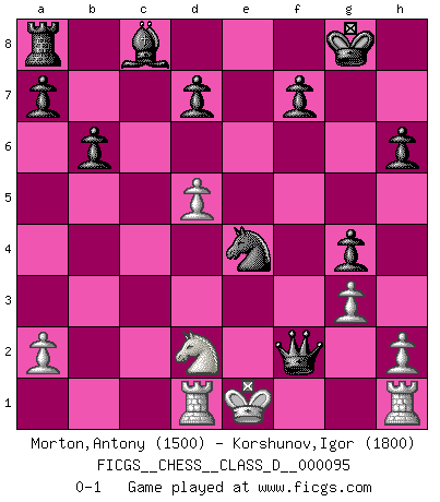 Last move : 0-1 2008 July 28 16:56:30 [Event "FICGS__CHESS__CLASS_D__000095"] [Site "FICGS"] [Date "2008.07.22"] [Round "1"] [White "Morton,Antony"] [Black "Korshunov,Igor"] [Result "0-1"] [WhiteElo "1500"] [BlackElo "1800"] 1.d4 Nf6 2.c4 e6 3.Bg5 h6 4.Bh4 Bb4+ 5.Nc3 c5 6.e3 cxd4 7.exd4 Nc6 8.Nf3 Qa5 9.Qb3 g5 10.Bg3 g4 11.d5 exd5 12.Nd2 Nd4 13.Qd1 O-O 14.Be5 Re8 15.cxd5 Rxe5+ 16.Be2 Bxc3 17.bxc3 Nxe2 18.Qxe2 Qxc3 19.Rd1 b6 20.Qxe5 Qxe5+ 21.Kf1 Qd4 22.g3 Ne4 23.Ke1 Qxf2+ 0-1 Neo-Indian (Seirawan) attack Kingside Castling by player Black (move 13) Player Black won this chess game. Follow this game move after move (download)I played Chess with him and would have beaten him sometimes only he always took back his last move, and ran the game out differently. (Mark Twain) Gewöhnliche Menschen denken nur daran, wie sie ihre Zeit verbringen. Ein intelligenter Mensch versucht, sie auszunutzen. (Arthur Schopenhauer) Todo lo que importa ante el tablero de Ajedrez son buenas jugadas. (Bobby Fischer) Le thème de l'attaque double intervient d'une manière ou d'une autre dans l'immense majorité des combinaisons. (Youri Averbakh) A cynic is a man who knows the price of everything but the value of nothing. (Oscar Wilde)