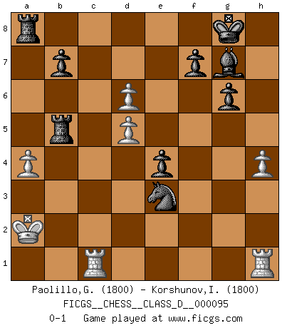 Last move : 0-1 2008 August 7 10:12:13 [Event "FICGS__CHESS__CLASS_D__000095"] [Site "FICGS"] [Date "2008.07.22"] [Round "1"] [White "Paolillo,Giampiero"] [Black "Korshunov,Igor"] [Result "0-1"] [WhiteElo "1800"] [BlackElo "1800"] 1.e4 c5 2.Nf3 d6 3.d4 cxd4 4.Nxd4 Nf6 5.Nc3 a6 6.Be3 e5 7.Nb3 Be6 8.f3 h5 9.Qd2 Nbd7 10.Nd5 Bxd5 11.exd5 g6 12.Be2 Bg7 13.O-O-O Qc7 14.Kb1 O-O 15.h4 Rfc8 16.Rc1 a5 17.a4 Nb6 18.Bxb6 Qxb6 19.g4 Qb4 20.Qxb4 axb4 21.Bb5 hxg4 22.fxg4 Nxg4 23.Bd7 Rc4 24.Bb5 Rf4 25.c4 bxc3 26.bxc3 Ne3 27.c4 e4 28.c5 Rf2 29.cxd6 Rb2+ 30.Ka1 Rxb3 31.Ka2 Rxb5 0-1 Sicilian : Najdorf, Byrne (English) attack Queenside Castling by player White (move 13) Kingside Castling by player Black (move 14) Player Black won this chess game. Follow this game move after move (download)I love all positions. Give me a difficult positional game, I will play it. But totally won positions, I cannot stand them. (Hein Donner) Es ist wirklich schade, dass so viele Schachspieler nicht auf ihr Äußeres achten! (Alexandra Kosteniuk) Coloca el contenido del tablero de Ajedrez en un sombrero, agita las piezas vigorosamente, derrámalas en el tablero desde una altura de medio metro y así obtienes el estilo de Wilhelm Steinitz. (H. E. Bird) D'abord les bases : Jouez et étudiez, puis étudiez et jouez, ensuite jouez et étudiez, puis étudiez et jouez. Deuxièmement : Donnez toujours le meilleur de vous-même ! (Ken Smith) Treat your password like your toothbrush. Don't let anybody else use it, and get a new one every six months. (Clifford Stoll)