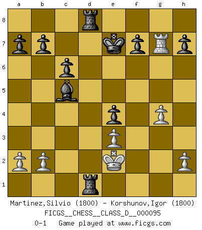 Last move : 0-1 2008 July 31 22:26:31 [Event "FICGS__CHESS__CLASS_D__000095"] [Site "FICGS"] [Date "2008.07.22"] [Round "1"] [White "Martinez,Silvio"] [Black "Korshunov,Igor"] [Result "0-1"] [WhiteElo "1800"] [BlackElo "1800"] 1.e4 c5 2.c4 Nc6 3.Nf3 Nf6 4.d4 cxd4 5.Nxd4 Nxe4 6.Nxc6 dxc6 7.Qxd8+ Kxd8 8.Be3 e5 9.Bd3 Nd6 10.Nc3 Be6 11.c5 Nf5 12.O-O Nxe3 13.fxe3 Bxc5 14.Rf3 Ke7 15.Kf1 Rad8 16.Rd1 Bg4 17.Rg3 Bxd1 18.Rxg7 Rxd3 19.Nxd1 Rxd1+ 20.Ke2 Rhd8 21.g4 e4 0-1 Sicilian defense Kingside Castling by player White (move 12) Player Black won this chess game. Follow this game move after move (download)A great player and a great example for many. His book My 60 Memorable Games had a big impact on me. It is a shame he didn't continue to enrich the world of chess with his unparalleled understanding after 1972. (Jan Timman, about Bobby Fischer's death) Mein Gehirn das ist mein zweitwichtigstes Organ [Aus dem Film: Der Schläfer]. (Woody Allen) Si tu oponente no puede hacer nada activo, entonces no apures la posición; En vez de eso, dejalo estar sentado ahí, sufriendo y rogandote por un empate. (Jeremy Silman) La tactique, c'est ce que vous faites quand il y a quelque chose à faire; la stratégie, c'est ce que vous faites quand il n'y a rien à faire. (Savielli Tartacower) Life is verb, not a noun. (Charlotte Perkins Gilman)
