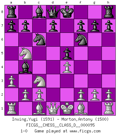 Last move : 1-0 2008 September 17 22:0:14 [Event "FICGS__CHESS__CLASS_D__000095"] [Site "FICGS"] [Date "2008.07.22"] [Round "1"] [White "Inving,Yugi"] [Black "Morton,Antony"] [Result "1-0"] [WhiteElo "1591"] [BlackElo "1500"] 1.e4 c5 2.Nf3 Nc6 3.d4 cxd4 4.Nxd4 Nf6 5.Nc3 e5 6.Ndb5 Bb4 7.a3 1-0 This chess game has been lost on time (started : 2008.07.22 3:44:28) Sicilian : Pelikan (Lasker/Sveshnikov) variation Player White won this chess game. Follow this game move after move (download)There is no remorse like the remorse of Chess. (H. G. Wells) Der Verteidiger gebe der Gewalt nach, aber nur der Gewalt. Er schaffe sich nicht freiwillig, etwa aus Blindheit oder aus Schrecken, irgendwelche Schwächen. Er lasse sich nicht bluffen. (Emanuel Lasker) Hasta este punto, las blancas han seguido un análisis bien conocido. Pero ahora el hace un error fatal: empieza a usar su propia cabeza. (Siegbert Tarrasch) Les échecs sont un jeu par leur forme, un art par leur essence et une science par sa difficulté d'acquisition. Ils peuvent vous procurer autant de plaisir qu'un bon livre ou une belle musique, mais vous n'aurez une réelle joie que si vous arrivez à bien jouer. (Tigran Petrosian) The only thing that matters is the evidence. (Horatio Caine, C.S.I. Miami)