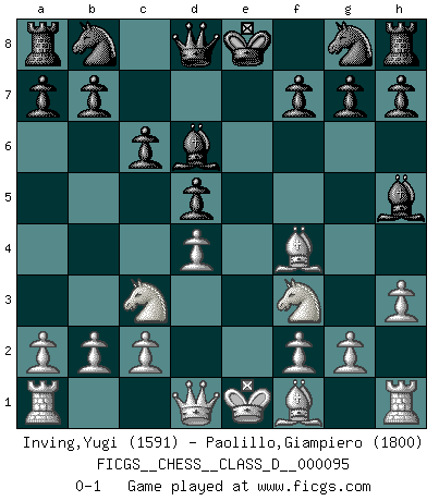 Last move : 0-1 2008 September 12 9:40:17 [Event "FICGS__CHESS__CLASS_D__000095"] [Site "FICGS"] [Date "2008.07.22"] [Round "1"] [White "Inving,Yugi"] [Black "Paolillo,Giampiero"] [Result "0-1"] [WhiteElo "1591"] [BlackElo "1800"] 1.e4 e6 2.Nf3 d5 3.exd5 exd5 4.Nc3 Bg4 5.h3 Bh5 6.d4 c6 7.Bf4 Bd6 0-1 This chess game has been lost on time (started : 2008.07.22 3:44:28) French defense Player Black won this chess game. Follow this game move after move (download)The winner of the game is the player who makes the next-to-last mistake. (Savielly Tartakover) Verschiedene, sehr schätzbare und im Laufe des Lebens nützliche Eigenschaften des Geistes können durch das Schachspiel erworben und gekräftigt werden, so dass sie zu Gewohnheiten werden, die uns nie im Stich lassen. (Benjamin Franklin) Cuando tu no sabes absolutamente que mas hacer, es tiempo de entrar en pánico. (John van der Wiel) On n'a jamais que l'âge auquel on a commence à jouer aux échecs car après on cesse de vieillir. (Capablanca) Beep ! (R2D2 in Star Wars ep.3)
