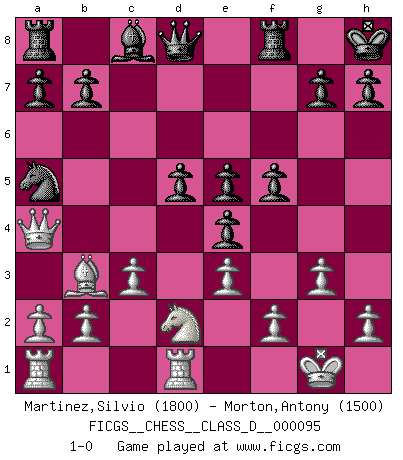 Last move : 1-0 2008 October 1 22:37:48 [Event "FICGS__CHESS__CLASS_D__000095"] [Site "FICGS"] [Date "2008.07.22"] [Round "1"] [White "Martinez,Silvio"] [Black "Morton,Antony"] [Result "1-0"] [WhiteElo "1800"] [BlackElo "1500"] 1.d4 Nf6 2.Nc3 d5 3.Nf3 e6 4.Bf4 Bb4 5.Bd2 O-O 6.e3 Ne4 7.Nxe4 Bxd2+ 8.Nfxd2 dxe4 9.g3 f5 10.Bc4 Nc6 11.O-O Kh8 12.c3 e5 13.d5 Na5 14.Qa4 c6 15.Rfd1 cxd5 16.Bb3 1-0 Queen's pawn game Kingside Castling by player Black (move 5) Kingside Castling by player White (move 11) Player White won this chess game. Follow this game move after move (download)When the Chess game is over, the Pawn and the King go back to the same box. (Irish saying) Frage: Gibt es etwas was Sie mehr lieben als Autobahnen ohne Tempobegrenzungen? - Antwort: Deutsche Frauen ohne Tempobegrenzungen. (Loek van Wely) Bobby Fischer es el mas grande genio de Ajedrez de todos los tiempos. (Alexander Kotov) Soyez une menace à chaque fois que vous vous asseyez pour jouer. (Ken Smith) Memory... is the diary that we all carry with us. (Oscar Wilde, The Importance of Being Earnest)