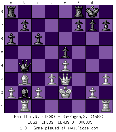 Last move : 1-0 2008 November 3 19:40:4 [Event "FICGS__CHESS__CLASS_D__000095"] [Site "FICGS"] [Date "2008.07.22"] [Round "1"] [White "Paolillo,Giampiero"] [Black "Gaffagan,Steven"] [Result "1-0"] [WhiteElo "1800"] [BlackElo "1583"] 1.e4 e5 2.Nc3 Bc5 3.Bc4 Nf6 4.f4 d6 5.Nf3 Nc6 6.d3 a6 7.Qe2 Bg4 8.Be3 Nd4 9.Bxd4 Bxd4 10.fxe5 dxe5 11.h3 Bxf3 12.Qxf3 Qd6 13.Nd5 Nxd5 14.Bxd5 Qb4+ 15.Ke2 O-O 16.Rab1 Bxb2 17.Qe3 c6 18.Bb3 1-0 This chess game has been lost on time (started : 2008.07.22 3:44:28) Vienna game Kingside Castling by player Black (move 15) Player White won this chess game. Follow this game move after move (download)Chess, like any creative activity, can exist only through the combined efforts of those who have creative talent, and those who have the ability to organize their creative work. (Mikhail Botvinnik) Wenn ein Kopf und ein Buch zusammenstoßen und es klingt hohl, ist es denn allemal im Buche? (Georg Christoph Lichtenberg) Tu eres para mi la Reina en d8 y yo soy el Peón en d7!!. (GM Eduard Gufeld) L'attaque fait le spectacle, la défense gagne les matchs. (Dicton footballistique) Big Chess is a place for big hallucinations. (Thibault de Vassal)