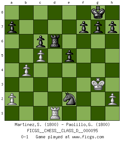 Last move : 0-1 2008 September 6 23:14:30 [Event "FICGS__CHESS__CLASS_D__000095"] [Site "FICGS"] [Date "2008.07.22"] [Round "1"] [White "Martinez,Silvio"] [Black "Paolillo,Giampiero"] [Result "0-1"] [WhiteElo "1800"] [BlackElo "1800"] 1.e4 e6 2.d4 d5 3.Nc3 Bb4 4.Bd2 dxe4 5.Nxe4 Bxd2+ 6.Qxd2 Nd7 7.Nf3 Ngf6 8.Nxf6+ Nxf6 9.Bc4 Bd7 10.O-O Bc6 11.c3 Bxf3 12.gxf3 O-O 13.f4 c5 14.Rfd1 cxd4 15.Qxd4 Qc7 16.Qd6 Qxc4 17.Rd4 Qc6 18.Qxc6 bxc6 19.Kg2 Rfd8 20.Rxd8+ Rxd8 21.c4 Rd3 22.b3 Nh5 23.f3 Nxf4+ 24.Kg3 Ne2+ 25.Kf2 Nd4 26.f4 Rf3+ 27.Kg2 Rxf4 28.Rd1 e5 29.b4 Rf6 30.Kg3 Rd6 31.c5 Ne2+ 0-1 French : Winawer, fingerslip variation Kingside Castling by player White (move 10) Kingside Castling by player Black (move 12) Player Black won this chess game. Follow this game move after move (download)Chess is a foolish expedient for making idle people believe they are doing something very clever when they are only wasting their time. (George Bernard Shaw) Der Vorposten provoziert a) eine Basis für neue Angriffe und b) eine Schwächung der gegnerischen Widerstandskraft in der fraglichen Linie. (Aaron Nimzowitsch) Los Peones son el alma de una partida de Ajedrez. (Francois Andre Danican Philidor) Les réformistes prétendent que les progrès de la théorie conduiront à la disparition des échecs, et qu'il faut, pour leur rendre vie, en remanier les règles. En réalité, qu'exprime cette affirmation? Le mépris de l'intuition, de l'imagination et de tous les autres éléments qui font des échecs un art. (Alexander Alekhine) Luck is when opportunity knocks and you answer. (Anonymous)