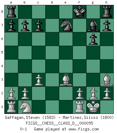 Last move : 0-1 2008 November 14 21:7:28 [Event "FICGS__CHESS__CLASS_D__000095"] [Site "FICGS"] [Date "2008.07.22"] [Round "1"] [White "Gaffagan,Steven"] [Black "Martinez,Silvio"] [Result "0-1"] [WhiteElo "1583"] [BlackElo "1800"] 1.e4 e5 2.Bc4 Nf6 3.d3 Nc6 4.Nf3 d6 5.Ng5 Be6 6.Nxe6 fxe6 7.Bxe6 Nd4 8.Bh3 d5 9.O-O dxe4 10.dxe4 Nxe4 11.Qh5+ g6 12.Qxe5+ Kf7 13.Qxe4 Bg7 14.c3 Nc6 15.Qe6+ Kf8 16.Be3 Qe7 17.Qxe7+ Nxe7 0-1 This chess game has been lost on time (started : 2008.07.22 3:44:28) Bishop's Opening : Berlin defense Kingside Castling by player White (move 9) Player Black won this chess game. Follow this game move after move (download)The blunders are all there on the board, waiting to be made. (Savielly Tartakover) Der Knackpunkt bei der Konzentration ist, daß wir nur durch sie etwas Neues und Ungewöhnliches am Schachbrett finden können. Sie ist der einzige Weg durch neue neue Ideen eine Überraschung zu bereiten. (Garry Kasparov) El tablero es el mundo, las piezas es el fenomeno del universo, las reglas del juego son lo que llamamos leyes de la naturaleza y el jugador del lado opuesto, se encuentra oculto a nuestra vista. (Thomas Huxley) La tactique est l'élément le plus important du milieu de jeu. (Siegbert Tarrasch) The intuitive mind is a sacred gift; the rational mind is a faithful servant. We have created a society that honors the servant but has forgotten the gift. (Albert Einstein)