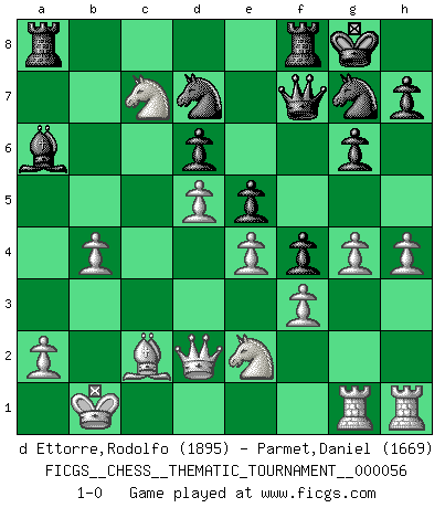 Last move : 1-0 2008 October 3 20:55:32 [Event "FICGS__CHESS__THEMATIC_TOURNAMENT__000056"] [Site "FICGS"] [Date "2008.07.25"] [Round "1"] [White "d Ettorre,Rodolfo"] [Black "Parmet,Daniel"] [Result "1-0"] [WhiteElo "1895"] [BlackElo "1669"] 1.d4 Nf6 2.c4 g6 3.Nc3 d6 4.e4 Bg7 5.f3 O-O 6.Be3 e5 7.d5 Nh5 8.Qd2 f5 9.O-O-O a6 10.Bd3 Nd7 11.Nge2 f4 12.Bf2 Bf6 13.Kb1 Bh4 14.Bxh4 Qxh4 15.g3 Qf6 16.g4 Ng7 17.h4 Nc5 18.Bc2 Qf7 19.Rdg1 b5 20.b4 Nd7 21.cxb5 axb5 22.Nxb5 Ba6 23.Nxc7 1-0 King's Indian defense, 3.Nc3 Kingside Castling by player Black (move 5) Queenside Castling by player White (move 9) Player White won this chess game. Follow this game move after move (download)The enormous mental resilience, without which no Chess player can exist, was so much taken up by Chess that he could never free his mind of this game. (Albert Einstein) Ein Gewinn durch eine ungenaue Kombination, sei sie auch noch so vorzeigbar, erfüllt mich mit Schaudern. (Wilhelm Steinitz) Solo los afeminados hacen el Enroque. (Rob Sillars) Celui qui prend des risques peut perdre, celui qui n'en prend pas perd toujours. (Xavier Tartacover) Some people are so afraid to die that they never begin to live. (Henry Van Dyke)