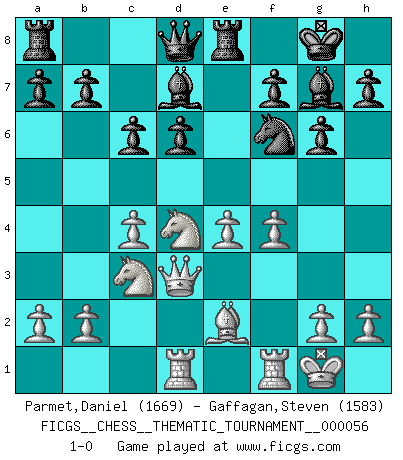 Last move : 1-0 2008 November 16 21:14:59 [Event "FICGS__CHESS__THEMATIC_TOURNAMENT__000056"] [Site "FICGS"] [Date "2008.07.25"] [Round "1"] [White "Parmet,Daniel"] [Black "Gaffagan,Steven"] [Result "1-0"] [WhiteElo "1669"] [BlackElo "1583"] 1.d4 Nf6 2.c4 g6 3.Nc3 Bg7 4.e4 d6 5.Nf3 O-O 6.Be2 e5 7.Be3 exd4 8.Bxd4 Nc6 9.Qd3 Nxd4 10.Nxd4 Re8 11.O-O Bd7 12.f4 c6 13.Rad1 1-0 This chess game has been lost on time (started : 2008.07.25 1:22:38) King's Indian : Gligoric-Taimanov system Kingside Castling by player Black (move 5) Kingside Castling by player White (move 11) Player White won this chess game. Follow this game move after move (download)Pawn endings are to Chess what putting is to golf. (Cecil Purdy) Fischer: 'Remis!?' Uhlmann: 'Aber es muss doch dreimal Zugwiederholung sein!' Fischer: 'Sie nehmen das Remis an, wie ich es sage, sonst spiele ich weiter und werde Sie dann schlagen!' (Robert James Fischer) Uno por uno, yo los acribillé, mi superioridad muy pronto se volvio aparente. (Jose Capablanca) Je ne crois pas en la psychologie, je crois aux bons coups. (Robert Fischer) Never risk one's whole fortune unless supported by one's entire army. (Niccolo Machiavelli)