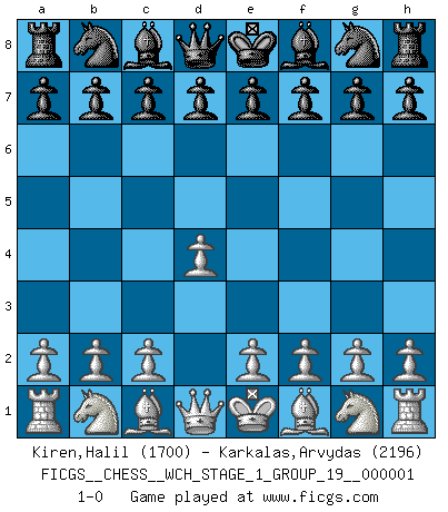 Last move : 1-0 2006 August 26 18:45:33 [Event "FICGS__CHESS__WCH_STAGE_1_GROUP_19__000001"] [Site "FICGS"] [Date "2006.07.27"] [Round "1"] [White "Kiren,Halil"] [Black "Karkalas,Arvydas"] [Result "1-0"] [WhiteElo "1700"] [BlackElo "2196"] 1.d4 1-0 This chess game has been lost on time (started : 2006.07.27 16:44:55) Queen's pawn Player White won this chess game. Follow this game move after move (download)Openings teach you openings. Endgames teach you chess ! (Stephan Gerzadowicz) Ein Großmeister muß tausende Partien in seinem Kopf speichern, denn diese sind für Ihn, was die Worte der Muttersprache für gewöhnliche Leute sind, oder Noten für Musiker... (Garry Kasparov) Aún el Rey más flojo huye despavorido ante la amenaza de un Jaque doble. (Aaron Nimzowitsch) Fischer est le meilleur joueur du monde et Karpov n'est qu'un joueur de bistrot. (Garry Kasparov, agé de 16 ans) I find television to be very educating. Every time somebody turns on the set, I go in the other room and read a book. (Groucho Marx)