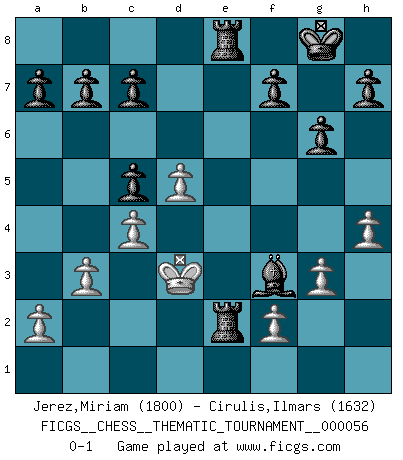 Last move : 0-1 2008 October 15 3:17:24 [Event "FICGS__CHESS__THEMATIC_TOURNAMENT__000056"] [Site "FICGS"] [Date "2008.07.25"] [Round "1"] [White "Jerez,Miriam"] [Black "Cirulis,Ilmars"] [Result "0-1"] [WhiteElo "1800"] [BlackElo "1632"] 1.d4 Nf6 2.c4 g6 3.e3 d6 4.Bd3 Bg7 5.Nf3 O-O 6.O-O e5 7.d5 e4 8.Bxe4 Nxe4 9.Nbd2 Nxd2 10.Qxd2 Qe7 11.Rb1 Qe4 12.b3 Qxb1 13.Ba3 Qe4 14.Ng5 Qe7 15.Nf3 Nd7 16.Re1 Nc5 17.Bxc5 dxc5 18.g3 Qf6 19.e4 Qxf3 20.Re3 Bh6 21.Rxf3 Bxd2 22.Kf1 Re8 23.Ke2 Bg4 24.Kxd2 Bxf3 25.Ke3 Rxe4+ 26.Kd3 Re2 27.h4 Rae8 0-1 King's Indian defense Kingside Castling by player Black (move 5) Kingside Castling by player White (move 6) Player Black won this chess game. Follow this game move after move (download)The hardest game to win is a won game. (Emanuel Lasker) Ja, ich habe einmal eine Blitzpartie gespielt, es war in einem Zug, 1929. --im Interview 1989 (Mikhail Moiseyevich Botvinik) Una compensación adecuada por un sacrificio es tener una combinación sólida que conduce a una posición ganadora; una compensación adecuada por una metida de pata es dejar a tu oponente arrebatar una derrota de las fauces de la victoria. (Bruce A. Moon) Echiquier : carré parfait, comme la Jérusalem nouvelle décrite par l'auteur de l'Apocalypse, huit cases sur huit, exaltation du chiffre 4, symbole du cosmos aux quatre horizons... où le noir et le blanc, l'ombre et la lumière, le mal et le bien s'entremêlent et se conjuguent. (Robert Couffignal, Le Gambit du poète) Panic is a sudden desertion of us, an a going over to the enemy of our imagination. (Christian Nevell Bovee)