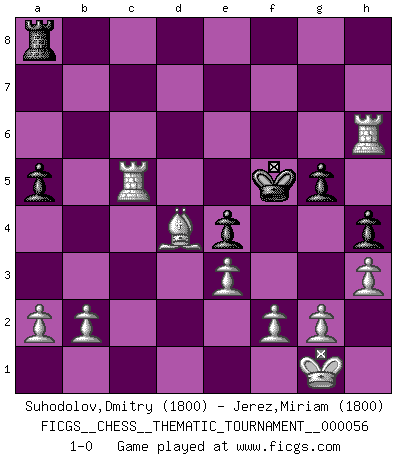 Last move : 1-0 2008 October 15 23:0:19 [Event "FICGS__CHESS__THEMATIC_TOURNAMENT__000056"] [Site "FICGS"] [Date "2008.07.25"] [Round "1"] [White "Suhodolov,Dmitry"] [Black "Jerez,Miriam"] [Result "1-0"] [WhiteElo "1800"] [BlackElo "1800"] 1.d4 Nf6 2.c4 g6 3.Nc3 d5 4.cxd5 Nxd5 5.Bd2 Nxc3 6.Bxc3 Nc6 7.d5 f6 8.dxc6 Qxd1+ 9.Rxd1 e5 10.cxb7 Bxb7 11.e3 Bc5 12.Nf3 O-O 13.Bc4+ Kg7 14.O-O h5 15.Rd7+ Kh6 16.Nxe5 fxe5 17.Rxc7 Bc8 18.Rxc5 e4 19.Bd5 Ba6 20.Bxa8 Rxa8 21.Rc1 h4 22.Bd4 g5 23.Rc6+ Kh5 24.Rxa6 Kg4 25.Rh6 a5 26.h3+ Kf5 27.Rc5+ 1-0 King's Indian defense, 3.Nc3 Kingside Castling by player Black (move 12) Kingside Castling by player White (move 14) Player White won this chess game. Follow this game move after move (download)Fischer Chess play was always razor-sharp, rational and brilliant. One of the best ever. (Dave Regis) Verschiedene, sehr schätzbare und im Laufe des Lebens nützliche Eigenschaften des Geistes können durch das Schachspiel erworben und gekräftigt werden, so dass sie zu Gewohnheiten werden, die uns nie im Stich lassen. (Benjamin Franklin) Nos gusta pensar. (Gary Kasparov) L'attaque fait le spectacle, la défense gagne les matchs. (Dicton footballistique) Waiting for chance ? Play in casinos. (FICGS proverb)