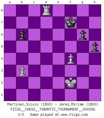 Last move : 1-0 2008 July 26 1:33:16 [Event "FICGS__CHESS__THEMATIC_TOURNAMENT__000056"] [Site "FICGS"] [Date "2008.07.25"] [Round "1"] [White "Martinez,Silvio"] [Black "Jerez,Miriam"] [Result "1-0"] [WhiteElo "1800"] [BlackElo "1800"] 1.d4 Nf6 2.c4 g6 3.Nf3 d5 4.c5 Ne4 5.Nc3 Bf5 6.g3 Nc6 7.Bg2 e6 8.O-O Bg7 9.Ne5 O-O 10.Bf4 Nxe5 11.Bxe5 Bxe5 12.dxe5 Nxc3 13.bxc3 b6 14.cxb6 cxb6 15.f3 Rc8 16.g4 Rxc3 17.gxf5 d4 18.fxg6 fxg6 19.Bh3 d3 20.Bxe6+ Kg7 21.exd3 Rxd3 22.Qb3 Rxb3 23.axb3 Re8 24.Rxa7+ Kh6 25.Rd7 Qg5 26.Kf2 Qh4 27.Ke3 Rxe6 28.f4 Qh3 29.Rf3 Qxh2 30.Rd6 Rxd6 31.exd6 Kg7 32.d7 Qg1 33.Rf2 Qe1 34.Re2 Qh4 35.Rd2 Kf7 36.d8Q Qxd8 37.Rxd8 h5 38.Kf2 1-0 King's Indian, 3.Nf3 Kingside Castling by player White (move 8) Kingside Castling by player Black (move 9) 10 pieces endgame at move 31 : White KRPPP , Black KQPPP WHITE : King + 1 Rook 3 Pawns BLACK : King + 1 Queen 3 Pawns Promotion Queen by player White (move 36) 9 pieces endgame at move 36 : White KRPP , Black KQPPP WHITE : King + 1 Rook 2 Pawns BLACK : King + 1 Queen 3 Pawns 8 pieces endgame at move 37 : White KRPP , Black KPPP WHITE : King + 1 Rook 2 Pawns BLACK : King + 3 Pawns Player White won this chess game. Follow this game move after move (download)A thorough understanding of the typical mating continuations makes the most complicated sacrificial combinations leading up to them not only not difficult, but almost a matter of course. (Siegbert Tarrasch) Fallen sollten polizeilich verboten werden. (Savielly Grigorievitsch Tartakower) El Ajedrez es un juego de pelea el cual es puramente intelectual e incluye la suerte. (Richard Reti) Le thème de l'attaque double intervient d'une manière ou d'une autre dans l'immense majorité des combinaisons. (Youri Averbakh) The beginning of wisdom is silence. The second step is listening. (Unknown)