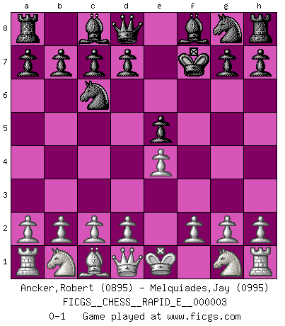 Last move : 0-1 2008 September 4 20:43:51 [Event "FICGS__CHESS__RAPID_E__000003"] [Site "FICGS"] [Date "2008.07.25"] [Round "1"] [White "Ancker,Robert"] [Black "Melquiades,Jay"] [Result "0-1"] [WhiteElo "0895"] [BlackElo "0995"] 1.e4 e5 2.Bc4 Nc6 3.Bxf7+ Kxf7 0-1 This chess game has been lost on time (started : 2008.07.25 12:6:14) Bishop's Opening Player Black won this chess game. Follow this game move after move (download)Becoming successful at Chess allows you to discover your own personality. That's what I want for the kids I teach. (Saudin Robovic) Rubinstein ist ein Turmendspiel, welches die Götter vor tausenden von Jahren begannen. (Savielly Grigorievitsch Tartakower) No soy una persona materialista y por eso, no resiento la falta o pérdida del dinero. La ausencia de cosas mundanas carece de importancia. Ya que el Ajedrez es una forma en la que puedo ser tan materialista como yo desee sin tener la necesidad de vender mi alma. (Jamie Walter Adams) Ce qui est bien, c'est d'avoir tout un tas de pièces en prise : l'adversaire ne peut en prendre qu'une à la fois. Cité par Thierry Audin. I have opinions of my own - strong opinions - but I don't always agree with them. (George Bush)