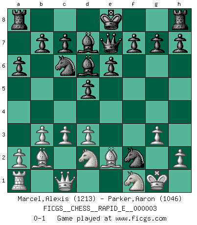 Last move : 0-1 2008 August 12 9:37:15 [Event "FICGS__CHESS__RAPID_E__000003"] [Site "FICGS"] [Date "2008.07.25"] [Round "1"] [White "Marcel,Alexis"] [Black "Parker,Aaron"] [Result "0-1"] [WhiteElo "1213"] [BlackElo "1046"] 1.f4 e6 2.Nf3 Qf6 3.e3 Nc6 4.Be2 d5 5.O-O Bd7 6.c3 Bd6 7.b3 a6 8.Bb2 Qe7 9.d3 Nf6 10.Nbd2 Ng4 11.Qc1 Nxe3 12.Rf2 Bxf4 13.g3 Bd6 14.Nf1 Ng4 15.N3d2 Nxf2 0-1 Bird's Opening Kingside Castling by player White (move 5) Player Black won this chess game. Follow this game move after move (download)Chess is so inspiring that I do not believe a good player is capable of having an evil thought during the game. (Wilhelm Steinitz) Es hat in meinem Leben Zeiten gegeben, in denen das Schachspiel, wenn nicht zum Lebenszweck, so doch zu einem regelrechten Lebensersatz geworden ist. Man fühlt sich in solchen Zeiten nicht so, als besäße man eine göttliche Gabe, sondern eher so, als sei man von ihr besessen. (Garry Kasparov) EL Ajedrez es como la vida. (Boris Spassky) Karpov est une pièce de musée. (Garry Kasparov) Everything in life is luck. (Donald Trump)