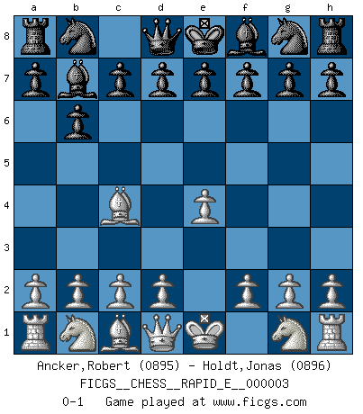 Last move : 0-1 2008 September 7 8:50:33 [Event "FICGS__CHESS__RAPID_E__000003"] [Site "FICGS"] [Date "2008.07.25"] [Round "1"] [White "Ancker,Robert"] [Black "Holdt,Jonas"] [Result "0-1"] [WhiteElo "0895"] [BlackElo "0896"] 1.e4 b6 2.Bc4 Bb7 0-1 This chess game has been lost on time (started : 2008.07.25 12:6:14) Owen defense Player Black won this chess game. Follow this game move after move (download)If I win a tournament, I win it by myself. I do the playing. Nobody helps me. (Bobby Fischer) Alle offensichtlichen Züge sehen nach dem Spiel in der Analyse verdächtig aus. (Viktor Kortschnoi) En posiciones complicadas, Bobby Fischer pocas veces tuvo que temer de cualquiera. (Paul Keres) Le jeu d'échecs est comme rejeté hors du temps. (Antoine de Saint-Exupéry) Programming can only do so much before it becomes too much. (Don Groves)