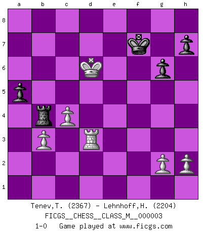 Last move : 1-0 2006 September 14 17:17:27 [Event "FICGS__CHESS__CLASS_M__000003"] [Site "FICGS"] [Date "2006.04.15"] [Round "1"] [White "Tenev,Toncho"] [Black "Lehnhoff,Heinz-Georg"] [Result "1-0"] [WhiteElo "2367"] [BlackElo "2204"] 1.e4 c5 2.Nf3 e6 3.d4 cxd4 4.Nxd4 a6 5.Nc3 Qc7 6.Be2 b5 7.O-O Bb7 8.Re1 Nc6 9.Nxc6 dxc6 10.e5 Bb4 11.a4 Ne7 12.Bd2 Bxc3 13.Bxc3 Nd5 14.Bd2 Qxe5 15.Bxb5 Qc7 16.Bd3 c5 17.Qg4 O-O 18.Qe4 Nf6 19.Qh4 e5 20.Re3 Qc6 21.Rg3 Rfe8 22.Re1 Rad8 23.Bc3 c4 24.Qh6 g6 25.Bf1 Rd5 26.Qh4 Rc5 27.Rge3 Nd7 28.Bb4 Rd5 29.Bxc4 Rd3 30.f3 Rxe3 31.Rxe3 Nf6 32.Bc3 Qd6 33.Qf2 Qc6 34.Qh4 Qd6 35.Rd3 Bd5 36.Rd1 Qc5+ 37.Kh1 Ne4 38.Rxd5 Qxc4 39.Rd3 Nd6 40.Qxc4 Nxc4 41.Kg1 f5 42.Kf2 Rc8 43.Ke2 Kf7 44.b3 Nb6 45.a5 e4 46.fxe4 fxe4 47.Rd2 e3 48.Kxe3 Rxc3+ 49.Kd4 Rc6 50.axb6 Rxb6 51.Kc5 Rb5+ 52.Kd6 Rb4 53.Rd3 a5 54.c4 1-0 Sicilian : Kan, 5.Nc3 Kingside Castling by player White (move 7) Kingside Castling by player Black (move 17) Player White won this chess game. Follow this game move after move (download)To avoid losing a piece, many a person has lost the game. (Savielly Tartakover) Ich tröste mich mit dem Vergnügen, daß Schachfans, Zuschauer und Leser glücklich sind, wenn ein Großmeister etwas riskiert, statt nur Klötzchen zu schieben. (Mikhail Nekhemyevich Tal) En partidas rápidas, el Caballo es mas poderoso que el Alfil. (Vlastimil Hort) Horreur, mais aussi harmonie suprême : qu'y avait-il en effet au monde en dehors des échecs ? Le brouillard, l'inconnu, le non-être... (Vladimir Nabokov) Rules and bones are meant to be broken. (Anonymous)