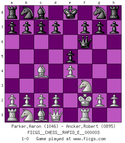 Last move : 1-0 2008 August 30 19:44:15 [Event "FICGS__CHESS__RAPID_E__000003"] [Site "FICGS"] [Date "2008.07.25"] [Round "1"] [White "Parker,Aaron"] [Black "Ancker,Robert"] [Result "1-0"] [WhiteElo "1046"] [BlackElo "0895"] 1.e4 e5 2.Nf3 Bc5 3.Bc4 Bxf2+ 4.Kxf2 Qf6 5.Rf1 1-0 This chess game has been lost on time (started : 2008.07.25 12:6:14) King's knight Opening Player White won this chess game. Follow this game move after move (download)The tactician must know what to do whenever something needs doing; the strategist must know what to do when nothing needs doing. (Savielly Tartakover) Schach ist wie eine schöne Frau, zu der wir ständig zurückkehren, gleichviel, wie oft sie uns zurückweist. (Anonymous) La partida mas dura de ganar es una partida ganada. (Emanuel Lasker) Les erreurs sont comme les malheurs, elles n'arrivent jamais seules. (Siegbert Tarrasch) To err is human, but to really foul things up requires a computer. (Farmer's Almanac, 1978)