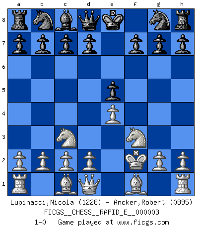 Last move : 1-0 2008 September 4 8:42:9 [Event "FICGS__CHESS__RAPID_E__000003"] [Site "FICGS"] [Date "2008.07.25"] [Round "1"] [White "Lupinacci,Nicola"] [Black "Ancker,Robert"] [Result "1-0"] [WhiteElo "1228"] [BlackElo "0895"] 1.e4 e5 2.Nf3 Bc5 3.Nc3 Bxf2+ 4.Kxf2 1-0 This chess game has been lost on time (started : 2008.07.25 12:6:14) King's knight Opening Player White won this chess game. Follow this game move after move (download)All that matters on the Chessboard is good moves. (Bobby Fischer) Viele Opfer benötigen überhaupt keine konkrete Berechnung. Es genügt sich die entstehende Position kurz vorzustellen, um uns davon zu überzeugen, dass das Opfer korrekt ist. (Mikhail Nekhemyevich Tal) El Ajedrez es un mar en el cual un mosquito puede beber y un elefante puede bañarse. (Refrán Hindú) Les écrivains ont utilisé les échecs pour analyser les côtés extrêmes de la nature humaine. Dans ce cadre, les échecs offrent un champ d'expérimentation idéal. Mais on pourrait faire la même chose avec la peinture. Et là, en vous référant à Van Gogh, vous ne tirerez pas de conclusion définitive sur les peintres. (Gary Kasparov) I believe in luck. How else can you explain the success of those you dislike ? (Jean Cocteau)