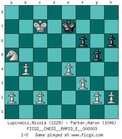 Last move : 1-0 2008 July 31 22:36:38 [Event "FICGS__CHESS__RAPID_E__000003"] [Site "FICGS"] [Date "2008.07.25"] [Round "1"] [White "Lupinacci,Nicola"] [Black "Parker,Aaron"] [Result "1-0"] [WhiteElo "1228"] [BlackElo "1046"] 1.e4 e5 2.Nf3 Nc6 3.d4 exd4 4.Nxd4 Nxd4 5.Qxd4 c5 6.Qe5+ Qe7 7.Qxe7+ Bxe7 8.Nc3 Bd6 9.Be3 a6 10.O-O-O Bf8 11.Nd5 Bd6 12.Nb6 Rb8 13.Rxd6 Nf6 14.f3 O-O 15.Bxc5 Ne8 16.Rd2 d6 17.Bb4 Be6 18.Bc4 Bxc4 19.Nxc4 b5 20.Nxd6 Rd8 21.Rhd1 Nc7 22.Nb7 Rxd2 23.Rxd2 Re8 24.Ba5 Ne6 25.Rd7 f6 26.Nd6 Rf8 27.Bb4 Ra8 28.Re7 Nd4 29.Re8+ Rxe8 30.Nxe8 Nc6 31.Bc5 a5 32.Nd6 b4 33.Kd2 Ne5 34.Nb7 Nc6 35.Kd3 Kf7 36.Kc4 Ne5+ 37.Kd5 Nd7 38.Nxa5 g5 39.Bxb4 Nb6+ 40.Kc6 Nc8 41.Bc5 h6 42.Kc7 Ne7 43.Bxe7 Kxe7 44.b4 1-0 Scotch game Queenside Castling by player White (move 10) Kingside Castling by player Black (move 14) Player White won this chess game. Follow this game move after move (download)Only the player with the initiative has the right to attack. (Wilhelm Steinitz) Es ist im Leben wie im Schachspiel. Wir entwerfen einen Plan, dieser bleibt jedoch bedingt durch das, was im Schachspiel dem Gegner, im Leben dem Schicksal zu tun belieben wird. (Arthur Schopenhauer) Un sacrificio se refuta mucho mejor al aceptarlo. (Wilhelm Steinitz) Celui qui prend des risques peut perdre, celui qui n'en prend pas perd toujours. (Xavier Tartacover) If you are going through hell, keep going. (Winston Churchill)