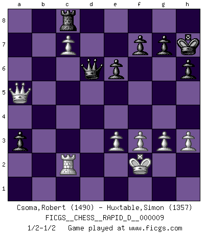 Last move : 1/2-1/2 2008 October 17 16:0:49 [Event "FICGS__CHESS__RAPID_D__000009"] [Site "FICGS"] [Date "2008.07.25"] [Round "1"] [White "Csoma,Robert"] [Black "Huxtable,Simon"] [Result "1/2-1/2"] [WhiteElo "1490"] [BlackElo "1357"] 1.Nf3 d5 2.d4 Bg4 3.Ne5 Nf6 4.Nxg4 Nxg4 5.h3 Nf6 6.c4 e6 7.Nc3 Bb4 8.Bf4 c5 9.e3 Nc6 10.dxc5 Bxc3+ 11.bxc3 Qa5 12.Qb3 Ne4 13.Rc1 Nxc5 14.Qb5 O-O 15.Bd6 Qxa2 16.Bxc5 a6 17.Qb1 Qa5 18.Bxf8 Rxf8 19.cxd5 Qxd5 20.Qxb7 a5 21.c4 Qd6 22.c5 Qd5 23.Qb5 Rb8 24.Qa6 Rd8 25.Qe2 Qb3 26.Qc4 Qb7 27.f3 Qd7 28.Be2 Qd2+ 29.Kf2 Ne5 30.Qc3 Nd3+ 31.Kg3 Nxc1 32.Rxc1 Qxe2 33.Re1 Qa6 34.c6 Rc8 35.Rc1 h6 36.c7 Qd6+ 37.Kf2 a4 38.Qa5 a3 39.g3 Kh7 40.Rc2 1/2-1/2 Reti Opening Kingside Castling by player Black (move 14) This chess game ended in a draw. Follow this game move after move (download)Later, I began to succeed in decisive games. Perhaps because I realized a very simple truth: not only was I worried, but also my opponent. (Mikhail Tal) Immer nach dem besten Zug zu suchen ist ziemlich unpraktisch. (Nigel Short) Un buen sacrificio es aquel que aunque no sea necesariamente sólido, deja a tu oponente aturdido y confuso. (Rudolph Spielmann) La victoire dans une partie d'Echecs appartient la plupart du temps à celui qui voit un peu plus loin que l'adversaire. (Lasker) Luck is when opportunity knocks and you answer. (Anonymous)