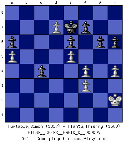 Last move : 0-1 2008 August 12 21:11:59 [Event "FICGS__CHESS__RAPID_D__000009"] [Site "FICGS"] [Date "2008.07.25"] [Round "1"] [White "Huxtable,Simon"] [Black "Plantu,Thierry"] [Result "0-1"] [WhiteElo "1357"] [BlackElo "1500"] 1.d4 d5 2.c4 dxc4 3.Nc3 e6 4.e4 Bb4 5.Bxc4 Nc6 6.Nf3 a6 7.O-O Nge7 8.Bg5 b5 9.Bb3 O-O 10.a3 Bxc3 11.bxc3 h6 12.Bh4 Bb7 13.Re1 Qd7 14.a4 b4 15.Bxe7 Qxe7 16.c4 Rad8 17.d5 Na5 18.Rc1 c6 19.Ba2 Qf6 20.e5 Qe7 21.d6 Qd7 22.c5 Rb8 23.Re4 Bc8 24.Rb1 Qa7 25.Qd4 b3 26.Bxb3 Rxb3 27.Rxb3 Nxb3 28.Qe3 Qb7 29.Qc3 Bd7 30.Rb4 Qa7 31.Rxb3 Rb8 32.a5 Rxb3 33.Qxb3 Qxc5 34.Qb8+ Kh7 35.Qb1+ g6 36.Qa1 Qb5 37.h3 c5 38.Nd2 Bc6 39.Qc3 Bd5 40.h4 Kg7 41.f4 Kf8 42.Kh2 Qe2 43.Nf3 Bxf3 44.Qxf3 Qxf3 45.gxf3 c4 46.d7 Ke7 0-1 Queen's gambit accepted Kingside Castling by player White (move 7) Kingside Castling by player Black (move 9) Player Black won this chess game. Follow this game move after move (download)Many Chess players were surprised when after the game, Fischer quietly explained: 'I had already analyzed this possibility' in a position which I thought was not possible to foresee from the opening. (Mikhail Tal) Ein Isolani verdüstert die Stimmung auf dem ganzen Schachbrett. (Savielly Grigorievitsch Tartakower) El Ajedrez es el juego mas altamente simbólico, pero las agresiones estan por lo tanto aún mas francamente representadas en la partida. Tal vez comenzo como un juego de guerra; Algo como la representación de una batalla en miniatura entre las fuerzas de dos reinos. (Karl Meninger) A ce moment-là, je menaçais de comprendre la position ! (Clément L'Heureux) Happy endings are just stories that haven't finished yet. (Jane Smith in Mr & Mrs Smith)