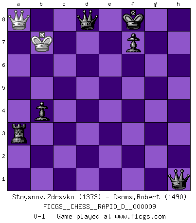 Last move : 0-1 2008 November 17 9:46:28 [Event "FICGS__CHESS__RAPID_D__000009"] [Site "FICGS"] [Date "2008.07.25"] [Round "1"] [White "Stoyanov,Zdravko"] [Black "Csoma,Robert"] [Result "0-1"] [WhiteElo "1373"] [BlackElo "1490"] 1.e4 d6 2.h3 Nf6 3.c3 Nxe4 4.Qa4+ Nc6 5.Qxe4 d5 6.Qa4 Bd7 7.Qd1 e5 8.d4 exd4 9.cxd4 Qf6 10.Be3 Bb4+ 11.Nc3 O-O 12.Qd2 Rfe8 13.O-O-O a5 14.a3 Bxc3 15.Qxc3 Ne7 16.Re1 c6 17.Nf3 Ng6 18.Bg5 Qd6 19.Be2 b5 20.Be3 b4 21.Qc5 Qb8 22.a4 Nf8 23.Ne5 Qc7 24.Bf4 Ne6 25.Nd3 Nxf4 26.Nxf4 Qxf4+ 27.Kd1 Qxf2 28.Qc2 Qxg2 29.Rhg1 Qf2 30.Rgf1 Qxd4+ 31.Bd3 g6 32.h4 Bf5 33.Kd2 Qxd3+ 34.Qxd3 Bxd3 35.Kxd3 Rxe1 36.Rxe1 Kf8 37.Kd4 Re8 38.Rc1 Re4+ 39.Kc5 Rxh4 40.Kb6 Rh2 41.b3 Rb2 42.Kxa5 Rxb3 43.Rxc6 h5 44.Rd6 h4 45.Rxd5 h3 46.Rd2 g5 47.Kb6 g4 48.a5 g3 49.a6 g2 50.Kb7 g1Q 51.a7 Qh1+ 52.Kb8 Ra3 53.Rd4 Qh2+ 54.Kb7 Qg2+ 55.Kb8 Qg3+ 56.Kb7 h2 57.Rd1 Qf3+ 58.Kb8 Qxd1 59.a8Q Qd8+ 60.Kb7 h1Q+ 0-1 King's pawn Opening Kingside Castling by player Black (move 11) Queenside Castling by player White (move 13) 10 pieces endgame at move 43 : White KRP , Black KRPPPPP WHITE : King + 1 Rook 1 Pawn BLACK : King + 1 Rook 5 Pawns 9 pieces endgame at move 45 : White KRP , Black KRPPPP WHITE : King + 1 Rook 1 Pawn BLACK : King + 1 Rook 4 Pawns Promotion Queen by player Black (move 50) 8 pieces endgame at move 58 : White KP , Black KQRPPP WHITE : King + 1 Pawn BLACK : King + 1 Queen 1 Rook 3 Pawns Promotion Queen by player White (move 59) Promotion Queen by player Black (move 60) Player Black won this chess game. Follow this game move after move (download)We must make sure that Chess will not be like a dead language, very interesting, but for a very small group. (Sytze Faber) Frage: Was machen Sie mit den Preisen? Anwort: Ich habe Angst, dass meine Freundin davon neue Kleider kauft. (Loek van Wely) Bobby es el jugador de Ajedrez mas fino que este país jamás haya producido. Su memoria para las movidas, su brillantez en soñar combinaciones y su feróz determinación por la victoria son algo extraño. (John Collins) Les erreurs sont comme les malheurs, elles n'arrivent jamais seules. (Siegbert Tarrasch) Hello Thibault, if I have had a plan (and I had one, I hope), I have forgotten it during the last week... - Hello Heinz-Georg. What do you mean a plan ? (Anonymous players, during a Big Chess game)