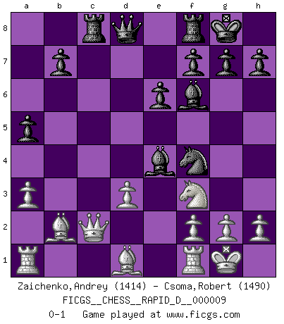 Last move : 0-1 2008 September 1 7:27:21 [Event "FICGS__CHESS__RAPID_D__000009"] [Site "FICGS"] [Date "2008.07.25"] [Round "1"] [White "Zaichenko,Andrey"] [Black "Csoma,Robert"] [Result "0-1"] [WhiteElo "1414"] [BlackElo "1490"] 1.b4 e6 2.Bb2 Nf6 3.a3 a5 4.b5 c6 5.c4 d5 6.e3 Be7 7.Nf3 O-O 8.Be2 Nbd7 9.O-O dxc4 10.Bxc4 Nb6 11.Be2 Bd7 12.Nc3 Nbd5 13.bxc6 Bxc6 14.d3 Nxc3 15.Bxc3 Nd5 16.Bb2 Bf6 17.Qc2 Rc8 18.e4 Nf4 19.Bd1 Bxe4 0-1 Polish (Sokolsky) opening Kingside Castling by player Black (move 7) Kingside Castling by player White (move 9) Player Black won this chess game. Follow this game move after move (download)Chess is a foolish expedient for making idle people believe they are doing something very clever when they are only wasting their time. (George Bernard Shaw) Du musst Deinen Gegner in einen tiefen dunklen Wald führen wo 2+2=5 ist und wo der Weg, der wieder hinausführt, nur breit genug für einen ist. (Mikhail Nekhemyevich Tal) El Ajedrez es como la guerra en un tablero. (Bobby Fischer) La vie et les Echecs sont tous les deux une lutte constante. (Lasker) In my experience, there's no such thing as luck. (Obi-Wan Kenobi in Star Wars ep.4)