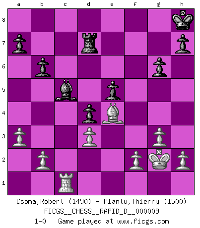 Last move : 1-0 2008 November 15 21:10:44 [Event "FICGS__CHESS__RAPID_D__000009"] [Site "FICGS"] [Date "2008.07.25"] [Round "1"] [White "Csoma,Robert"] [Black "Plantu,Thierry"] [Result "1-0"] [WhiteElo "1490"] [BlackElo "1500"] 1.Nf3 c5 2.c4 Nf6 3.Nc3 Nc6 4.g3 e5 5.e4 Be7 6.Bg2 d6 7.O-O O-O 8.d3 Bg4 9.Qb3 b6 10.Be3 Nd4 11.Bxd4 cxd4 12.Nd5 Nxd5 13.cxd5 Rc8 14.Rac1 Bxf3 15.Bxf3 f5 16.Rc6 Rxc6 17.dxc6 Kh8 18.exf5 Rxf5 19.Be4 Rf8 20.Qc4 Qc7 21.Qe6 Rf6 22.Qd7 Qxd7 23.cxd7 d5 24.Bxd5 Rd6 25.Be4 Rxd7 26.Rc1 g6 27.Kg2 Bc5 28.a3 1-0 This chess game has been lost on time (started : 2008.07.25 18:34:42) Reti Opening Kingside Castling by player White (move 7) Kingside Castling by player Black (move 7) Player White won this chess game. Follow this game move after move (download)The King is a fighting piece. Use it ! (Wilhelm Steinitz) Der zweitbeste Zug ist oft der einzig richtige. (Savielly Grigorievitsch Tartakower) El Ajedrez te enseña a controlarl la excitación inicial que sientes cuando vez algo que parece bueno y te enseña a pensar objetivamente cuando te encuentras en problemas. (Stanley Kubrick) Le profane ne songe pas à la somme de jouissance dont il se prive, qui méconnaît ce jeu aux ressources aussi variées que passionnantes. (Jean-Marie Jeanton-Lamarche) I'll be back. (Arnold Schwarzenegger)