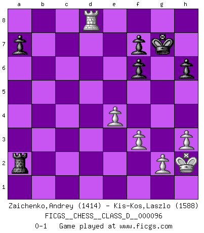 Last move : 0-1 2008 November 24 9:54:47 [Event "FICGS__CHESS__CLASS_D__000096"] [Site "FICGS"] [Date "2008.07.25"] [Round "1"] [White "Zaichenko,Andrey"] [Black "Kis-Kos,Laszlo"] [Result "0-1"] [WhiteElo "1414"] [BlackElo "1588"] 1.b4 e5 2.Bb2 Bxb4 3.Bxe5 Nf6 4.Nf3 Nc6 5.Bb2 d5 6.e3 O-O 7.c4 Bf5 8.cxd5 Qxd5 9.Nc3 Qe6 10.Be2 Rad8 11.O-O Bxc3 12.Bxc3 Ne4 13.Bb2 h6 14.d3 Rfe8 15.Qc2 Nf6 16.e4 Bg4 17.h3 Bxf3 18.Bxf3 Nb4 19.Qxc7 Nxd3 20.Bxf6 Qxf6 21.Qxb7 Re7 22.Qb3 Rc7 23.Rfd1 Qd4 24.Rf1 Ne5 25.Rfd1 Nxf3+ 26.Qxf3 Qf6 27.Qxf6 Rxd1+ 28.Rxd1 gxf6 29.Rd8+ Kg7 30.f3 Rc2 31.Kh2 Rxa2 0-1 Polish (Sokolsky) opening Kingside Castling by player Black (move 6) Kingside Castling by player White (move 11) Player Black won this chess game. Follow this game move after move (download)I guess a certain amount of temperament is expected of Chess geniuses. (Ron Gross) Wie gewinnt Tal? Er entwickelt alle seine Figuren in die Brettmitte und opfert sie dann irgendwo. (Robert James Fischer) Un sacrificio se refuta mucho mejor al aceptarlo. (Wilhelm Steinitz) Avec des compensations pour le matériel en plus... (Anonyme) A person who never made a mistake never tried anything new. (Albert Einstein)