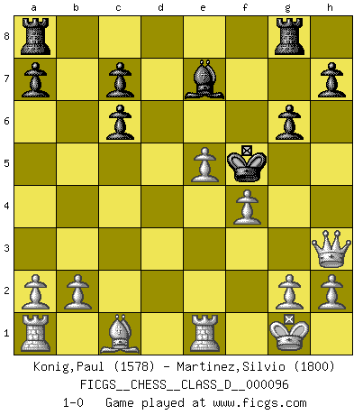 Last move : 1-0 2008 October 6 1:43:27 [Event "FICGS__CHESS__CLASS_D__000096"] [Site "FICGS"] [Date "2008.07.25"] [Round "1"] [White "Konig,Paul"] [Black "Martinez,Silvio"] [Result "1-0"] [WhiteElo "1578"] [BlackElo "1800"] 1.c4 d5 2.cxd5 Qxd5 3.Nc3 Qd8 4.d4 Nf6 5.e4 Nc6 6.Bb5 Bd7 7.e5 Ng8 8.f4 e6 9.Nf3 Nge7 10.O-O Nd5 11.Bc4 f5 12.Nxd5 exd5 13.Bxd5 g6 14.Ng5 Qe7 15.Nf7 Rg8 16.Re1 Be6 17.Bxe6 Qxe6 18.Nd6+ Kd7 19.d5 Qe7 20.dxc6+ bxc6 21.Nxf5 Ke6 22.Nxe7 Bxe7 23.Qb3+ Kf5 24.Qh3+ 1-0 English Opening Kingside Castling by player White (move 10) Player White won this chess game. Follow this game move after move (download)Blessed be the memory of him who gave the world this immortal game. (A. G. Gardiner) Die FIDE ist dabei in die Hände der russischen Mafia zu fallen. (Larry Evans) Te sientas frente a un tablero y repentinamente tu corazón brinca. Tu mano tiembla al tomar una pieza y moverla. Pero lo que el Ajedrez te enseña es que tu debes permanecer ahí con calma y pensar de que si realmente es una buena idea o de que si hay otras ideas mejores. (Stanley Kubrick) Il a essayé de se convaincre qu'il pourrait empêcher toutes les erreurs et ne jamais perdre. L'horreur ! Gary Kasparov au sujet de Robert Fischer. A woman without a man is like a fish without a bicycle. (Gloria Steinem)