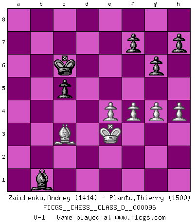 Last move : 0-1 2008 November 21 21:43:16 [Event "FICGS__CHESS__CLASS_D__000096"] [Site "FICGS"] [Date "2008.07.25"] [Round "1"] [White "Zaichenko,Andrey"] [Black "Plantu,Thierry"] [Result "0-1"] [WhiteElo "1414"] [BlackElo "1500"] 1.b4 e5 2.Bb2 e4 3.e3 Nf6 4.b5 d5 5.c4 Be6 6.cxd5 Bxd5 7.a3 c6 8.Nc3 Qb6 9.a4 a6 10.d3 Bb4 11.dxe4 Nxe4 12.Qd3 axb5 13.axb5 Rxa1+ 14.Bxa1 Qc5 15.Nge2 O-O 16.g3 Qc4 17.Qxc4 Bxc4 18.bxc6 bxc6 19.Bg2 Bxe2 20.Bxe4 Bb5 21.f3 Nd7 22.Kf2 Bxc3 23.Bxc3 Nc5 24.Bc2 Ra8 25.Ra1 Rxa1 26.Bxa1 g6 27.h4 Kf8 28.Bd4 Nd3+ 29.Bxd3 Bxd3 30.Ke1 Ke7 31.Kd2 Bf1 32.e4 Bg2 33.Ke3 Kd6 34.g4 c5 35.Bc3 Kc6 36.Kf2 Bh3 37.Kg3 Bf1 38.Kf2 Ba6 39.f4 Bd3 40.Ke3 Bb1 0-1 Polish (Sokolsky) opening Kingside Castling by player Black (move 15) Player Black won this chess game. Follow this game move after move (download)Good offense and good defense both begin with good development. (Bruce A. Moon) Schach ist ein Kampf gegen den Fehler. (Johannes Herrman Zukertort) Aquel que teme a un Peón de Reina aislado, debería de retirarse del Ajedrez. (Siegbert Tarrasch) La vie et les Echecs sont tous les deux une lutte constante. (Lasker) The Internet is so big, so powerful and pointless that for some people it is a complete substitute for life. (Andrew Brown)