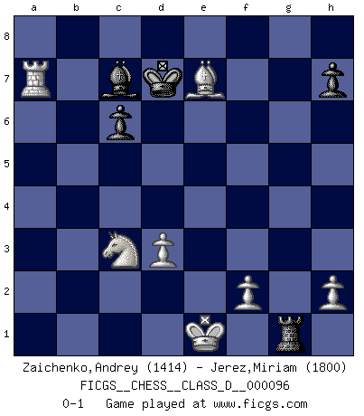 Last move : 0-1 2008 November 23 9:47:57 [Event "FICGS__CHESS__CLASS_D__000096"] [Site "FICGS"] [Date "2008.07.25"] [Round "1"] [White "Zaichenko,Andrey"] [Black "Jerez,Miriam"] [Result "0-1"] [WhiteElo "1414"] [BlackElo "1800"] 1.b4 d5 2.Bb2 e5 3.Bxe5 Nc6 4.Nf3 Bxb4 5.Bxg7 Bg4 6.Bxh8 Bxf3 7.exf3 Qe7+ 8.Qe2 Qxe2+ 9.Bxe2 Nge7 10.O-O Kd7 11.Bf6 Rg8 12.a3 Bc5 13.Nc3 d4 14.Na4 Bd6 15.c3 dxc3 16.Nxc3 Ke6 17.Bh4 Nd4 18.Bc4+ Kd7 19.Bxf7 Rg7 20.Bc4 Nc2 21.Rab1 Nxa3 22.Bb5+ c6 23.Bxc6+ bxc6 24.Rb7+ Bc7 25.Rxa7 Nc4 26.d3 Nd2 27.Re1 Nxf3+ 28.Kf1 Nxe1 29.Kxe1 Rxg2 30.Bxe7 Rg1+ 0-1 Polish (Sokolsky) opening Kingside Castling by player White (move 10) Player Black won this chess game. Follow this game move after move (download)Chess problems demand from the composer the same virtues that characterize all worthwhile art: originality, invention, conciseness, harmony, complexity, and splendid insincerity. (Vladimir Nabokov) Jeder weiß, dass Gasprom Putins persönliches Machtinstrument ist. Die Firma wird vom Kreml aus geleitet und wird schon deshalb nie transparent sein. (Garry Kasparov) Juega la Apertura como un libro, el Juego Medio como un mago y los Finales como una máquina. (Spielmann) Les Echecs ont trois composantes : le temps, l'espace et le matériel en dernier. (Mikhail Tal) Everything in life is luck. (Donald Trump)