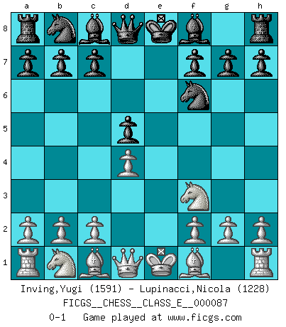 Last move : 0-1 2008 September 18 22:2:15 [Event "FICGS__CHESS__CLASS_E__000087"] [Site "FICGS"] [Date "2008.07.26"] [Round "1"] [White "Inving,Yugi"] [Black "Lupinacci,Nicola"] [Result "0-1"] [WhiteElo "1591"] [BlackElo "1228"] 1.e4 e6 2.Nf3 d5 3.exd5 exd5 4.d4 Nf6 0-1 This chess game has been lost on time (started : 2008.07.26 15:35:21) French defense Player Black won this chess game. Follow this game move after move (download)The tactician must know what to do whenever something needs doing; the strategist must know what to do when nothing needs doing. (Savielly Tartakover) Was ist der Unterschied zwischen einem Strassenarbeiter und einem Schachspieler? --Der Schachspieler bewegt sich ab und zu. (Anonymous) Una buena memoria, concentración, imaginación y una fuerte voluntad, se requiere para llegar a ser un buen jugador. (Bobby Fischer) Ce n'est pas pour s'amuser qu'il joue aux échecs : il célèbre un culte. (Vladimir Nabokov) Wisdom doesn't necessarily come with age. Sometimes age just shows up all by itself. (Tom Watson)