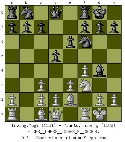 Last move : 0-1 2008 September 6 8:47:22 [Event "FICGS__CHESS__CLASS_E__000087"] [Site "FICGS"] [Date "2008.07.26"] [Round "1"] [White "Inving,Yugi"] [Black "Plantu,Thierry"] [Result "0-1"] [WhiteElo "1591"] [BlackElo "1500"] 1.f4 Nf6 2.Nf3 d5 3.e3 Bg4 4.Nc3 e6 5.Be2 Bb4 6.O-O Bxc3 7.bxc3 O-O 0-1 This chess game has been lost on time (started : 2008.07.26 15:35:21) Bird's Opening Kingside Castling by player White (move 6) Kingside Castling by player Black (move 7) Player Black won this chess game. Follow this game move after move (download)All that matters on the Chessboard is good moves. (Bobby Fischer) Schach ist das schnellste Spiel der Welt, weil man in jeder Sekunde Tausende von Gedanken ordnen muß. (Albert Einstein) a manera como él juega al Ajedrez, demuestra la completa naturaleza de un hombre. (Stanley Ellin) Des combinaisons [dans le jeu d'échecs] pareilles à des mélodies. Je crois entendre pour ainsi dire la musique des coups... (Vladimir Nabokov) Lottery : A tax on people who are bad at math. (Author unknown)