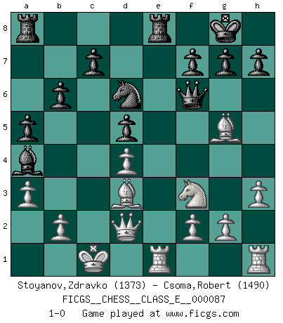 Last move : 1-0 2008 August 25 17:0:22 [Event "FICGS__CHESS__CLASS_E__000087"] [Site "FICGS"] [Date "2008.07.26"] [Round "1"] [White "Stoyanov,Zdravko"] [Black "Csoma,Robert"] [Result "1-0"] [WhiteElo "1373"] [BlackElo "1490"] 1.e4 d6 2.h3 Nf6 3.c3 Nxe4 4.Qa4+ Nc6 5.Qxe4 d5 6.Qa4 Bd7 7.Qd1 e5 8.d4 exd4 9.cxd4 Qf6 10.Be3 Bb4+ 11.Nc3 O-O 12.Qd2 Rfe8 13.O-O-O a5 14.a3 Bxc3 15.Qxc3 Ne7 16.Qd2 Nf5 17.Nf3 Ba4 18.Re1 b6 19.Bd3 Nd6 20.Bg5 1-0 King's pawn Opening Kingside Castling by player Black (move 11) Queenside Castling by player White (move 13) Player White won this chess game. Follow this game move after move (download)I'd rather have a Pawn than a finger. (Reuben Fine) Das Schach ist nichts für kleine Geister, es beansprucht einen vollen Mann, der sich nicht sklavisch an das Überlieferte hält, sondern selbständig die Tiefen des Spiels zu ergründen sucht. (Wilhelm Steinitz) A la fecha, Fischer esta simplemente un nivel arriba de todos los mejores jugadores de Ajedrez del mundo. (John Jacobs) Avec des compensations pour le matériel en plus... (Anonyme) Control your own destiny or someone else will. (Jack Welch)