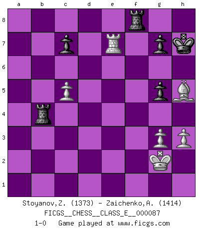 Last move : 1-0 2008 November 16 21:14:59 [Event "FICGS__CHESS__CLASS_E__000087"] [Site "FICGS"] [Date "2008.07.26"] [Round "1"] [White "Stoyanov,Zdravko"] [Black "Zaichenko,Andrey"] [Result "1-0"] [WhiteElo "1373"] [BlackElo "1414"] 1.e4 e5 2.Nf3 Nf6 3.d3 Nc6 4.a3 d5 5.exd5 Nxd5 6.Be2 Bc5 7.h3 O-O 8.O-O Bf5 9.Re1 h6 10.c4 Nf6 11.Nh4 Bg6 12.Nxg6 fxg6 13.Bf3 Qd4 14.Qe2 Bd6 15.Nc3 Qh4 16.Nb5 Nd4 17.Nxd4 Qxd4 18.Bxb7 Rab8 19.Be3 Qh4 20.Bf3 a6 21.b4 e4 22.dxe4 Nxe4 23.c5 Be5 24.Rad1 Nc3 25.Qc2 Nxd1 26.Qxd1 Rbd8 27.Qe2 g5 28.Bg4 Rde8 29.Qxa6 h5 30.Be6+ Kh8 31.Qc4 Bf4 32.Bxf4 Rxf4 33.g3 Qxg3+ 34.fxg3 Rxc4 35.Kf2 Rf8+ 36.Kg2 Rc2+ 37.Kg1 Rc3 38.Kg2 Rxa3 39.Bd5 Rd3 40.Bc4 Rd4 41.Be2 Rxb4 42.Bxh5 Kh7 43.Re7 1-0 Petrov's defense Kingside Castling by player Black (move 7) Kingside Castling by player White (move 8) Player White won this chess game. Follow this game move after move (download)Everything is in a state of flux, and this includes the world of Chess. (Mikhail Botvinnik) Ich verstehe mehr vom Schach als irgendein anderer lebender Meister. (José Raúl Capablanca) ¿Esta Bobby Fischer algo cuerdo?. (Salo Flohr) Vous n'êtes pas toujours obligé de jouer le meilleur coup. Un coup doit être actif, entreprenant, correct et beau ! (David Bronstein) If you know the enemy and know yourself you need not fear the results of a hundred battles. (Sun Tzu)