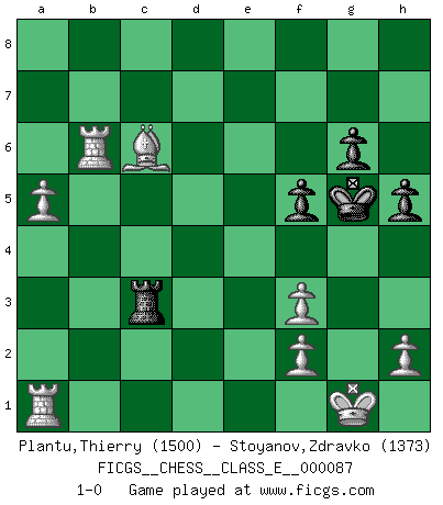 Last move : 1-0 2008 August 10 8:40:0 [Event "FICGS__CHESS__CLASS_E__000087"] [Site "FICGS"] [Date "2008.07.26"] [Round "1"] [White "Plantu,Thierry"] [Black "Stoyanov,Zdravko"] [Result "1-0"] [WhiteElo "1500"] [BlackElo "1373"] 1.c4 e6 2.d4 Nf6 3.Nc3 Bb4 4.a3 Bxc3+ 5.bxc3 O-O 6.Nf3 Ne4 7.e3 Nxc3 8.Qc2 Nd5 9.cxd5 exd5 10.Bd3 g6 11.O-O b6 12.e4 Bb7 13.Bf4 Re8 14.exd5 d6 15.Rac1 Bxd5 16.Qxc7 Qf6 17.Qxd6 Qxd6 18.Bxd6 Bxf3 19.gxf3 Rd8 20.Be4 Rxd6 21.Bxa8 Rxd4 22.Rc8+ Kg7 23.Rxb8 Rd3 24.Ra1 Kh6 25.Rc8 Kg5 26.Rc7 Kf6 27.Rxa7 b5 28.Ra6+ Kg7 29.Rb6 Rd8 30.Be4 f5 31.Rb7+ Kh6 32.Bc6 Rd3 33.Rxb5 Rc3 34.Rb6 Kg5 35.a4 h5 36.a5 1-0 English Opening Kingside Castling by player Black (move 5) Kingside Castling by player White (move 11) Player White won this chess game. Follow this game move after move (download)When you are lonely, when you feel yourself an alien in the world, play Chess. This will raise your spirits and be your counselor in war. (Aristotle) Wie bekannt hörte Morphy 1859 auf, Schach zu spielen. Seine Enttäuschung galt nicht so sehr dem Schach, wie den Schachspielern. (Robert James Fischer) La pasion por jugar al Ajedrez es una de las mas inexplicables en el mundo. (H.G. Wells) On peut tirer plus d'utilité d'une partie perdue que de 100 parties gagnées. (Capablanca) Without deviation from the norm, progress is not possible. (Frank Zappa)